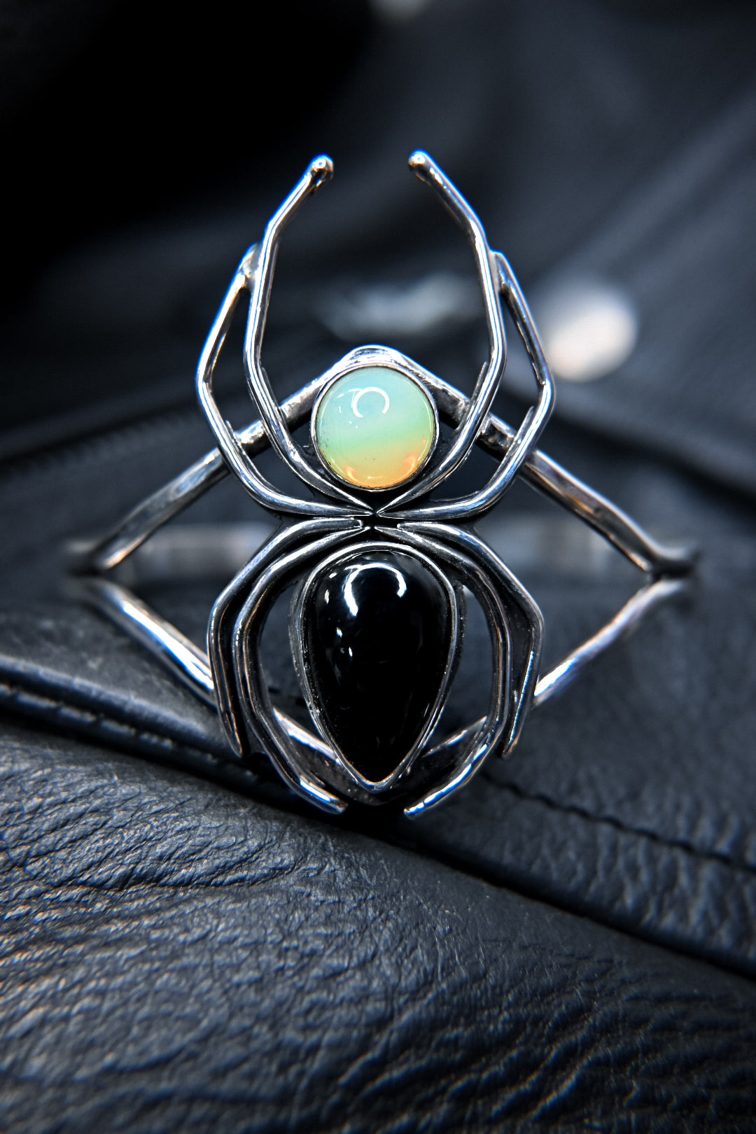 A spider spun from silver and stone — this cuff bracelet weaves together shadow and light. The body is shaped from rainbow obsidian, its dark surface revealing subtle flashes when caught by the right angle. Above it rests a glowing orb of uranium glass, its eerie green fire lending an otherworldly presence. Together, they create a creature both elegant and unsettling, forever poised on your wrist.