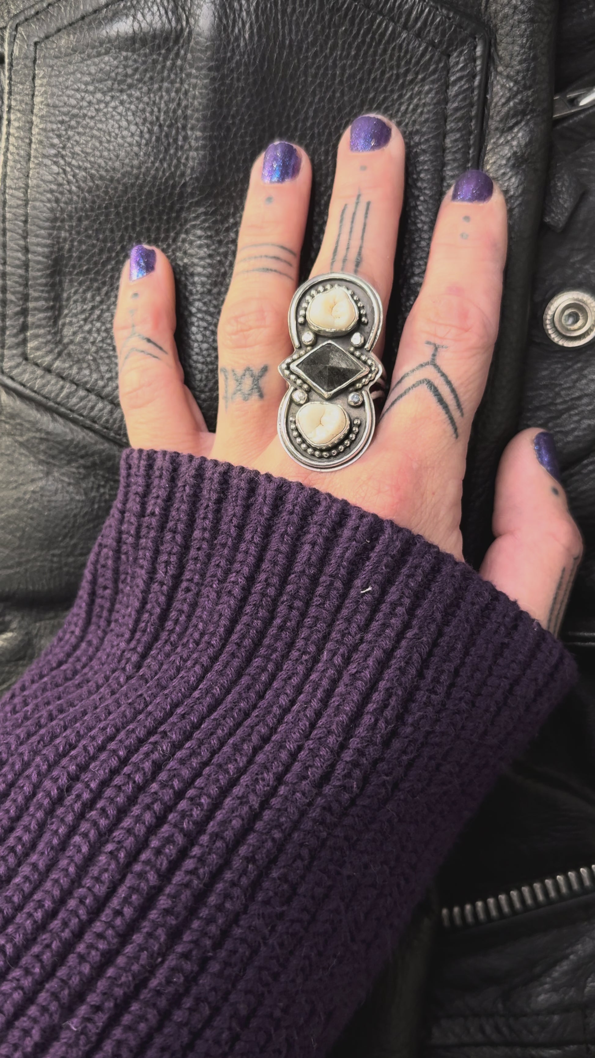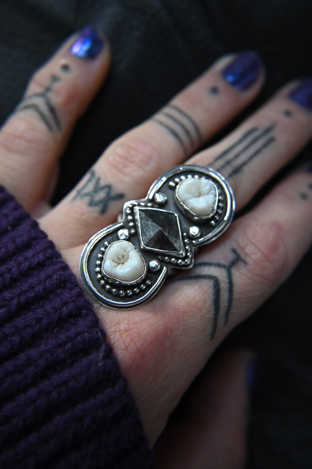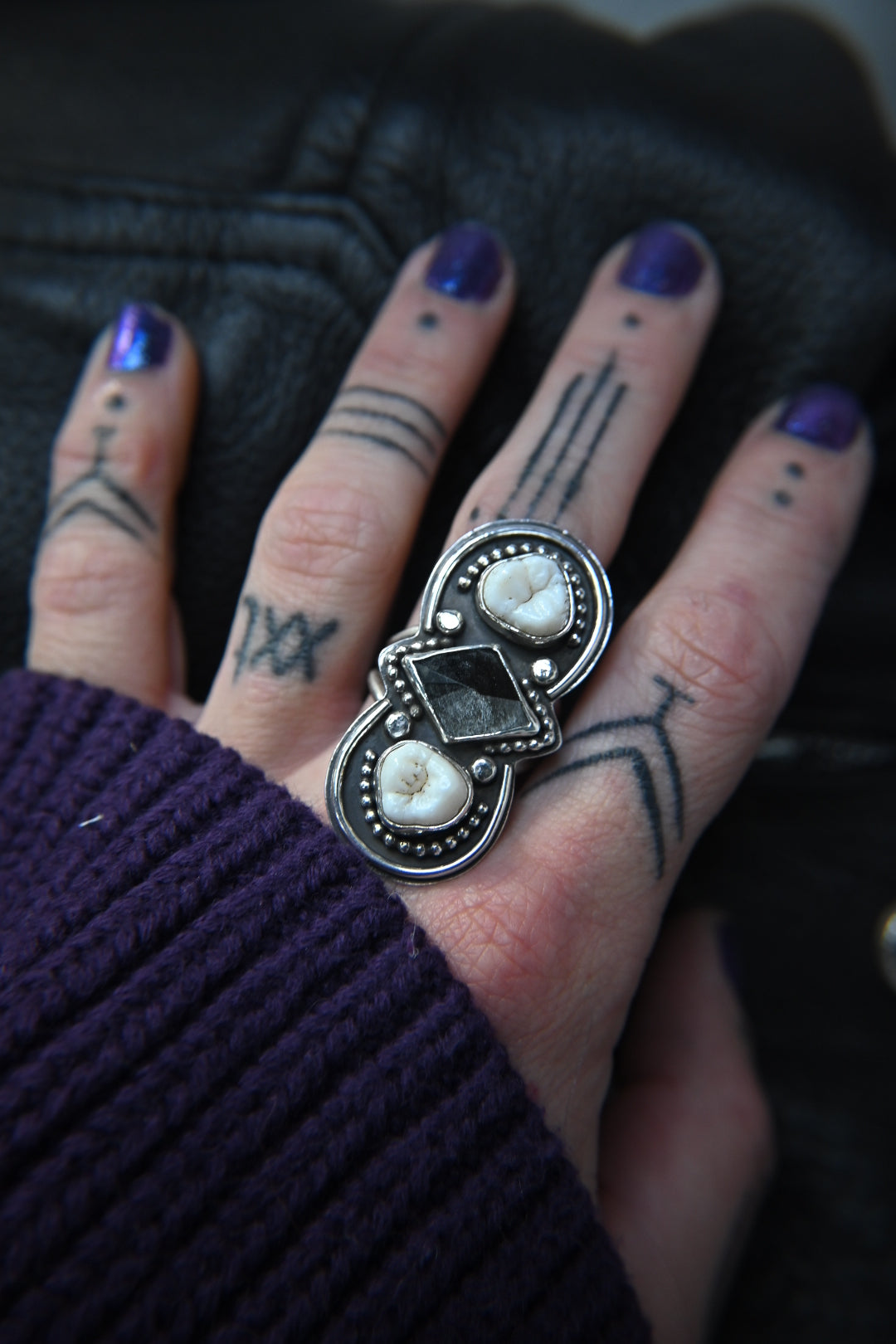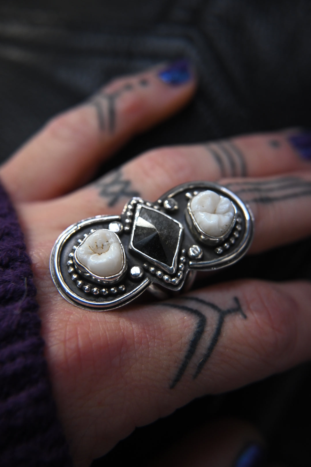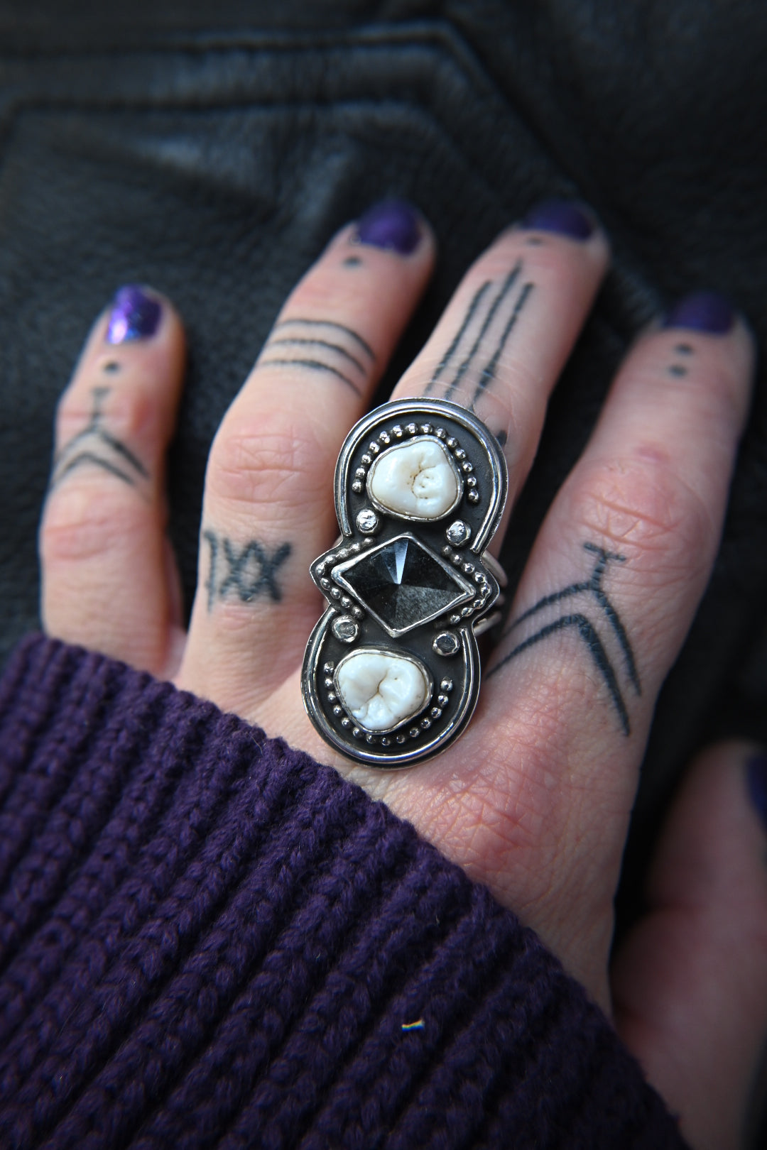 100% fine and sterling silver with added patina to bring out the details of each piece