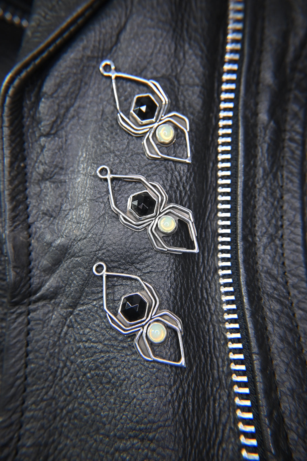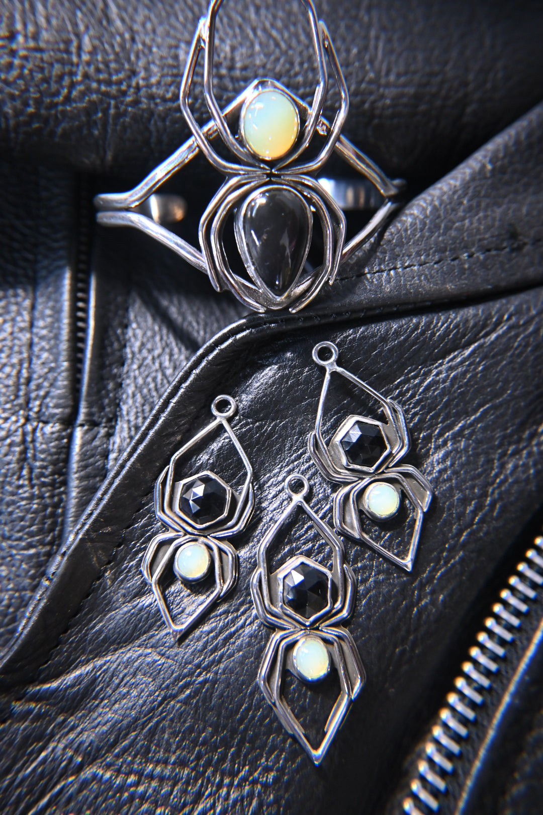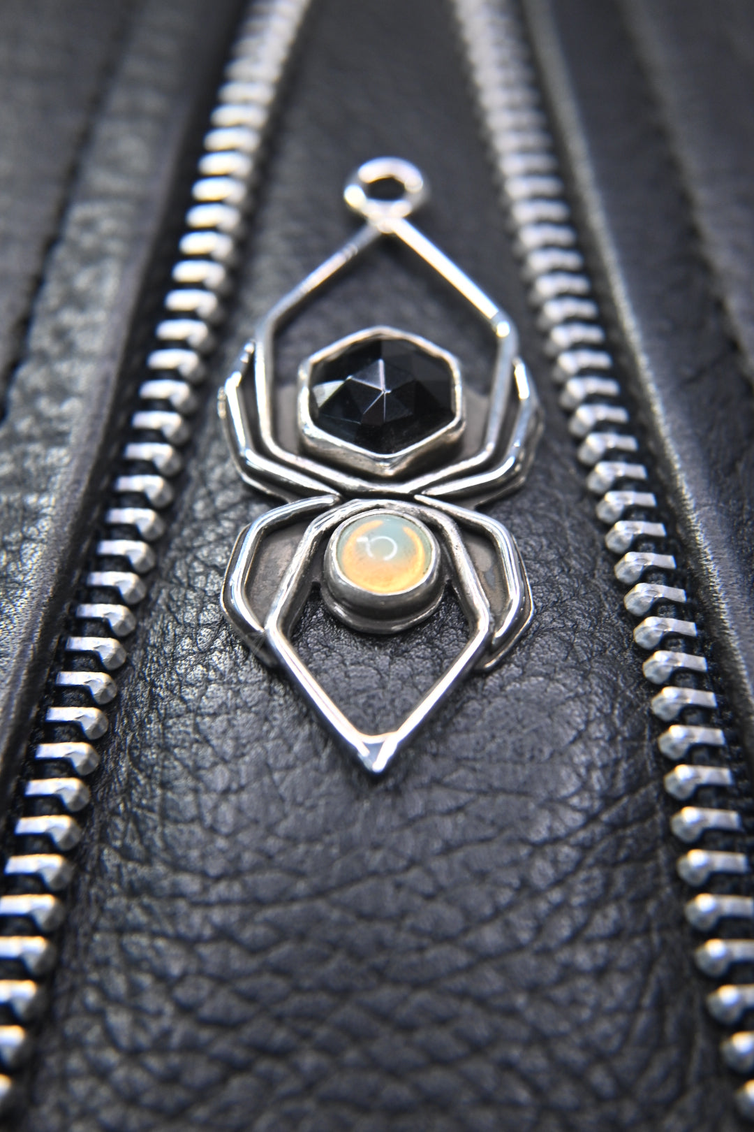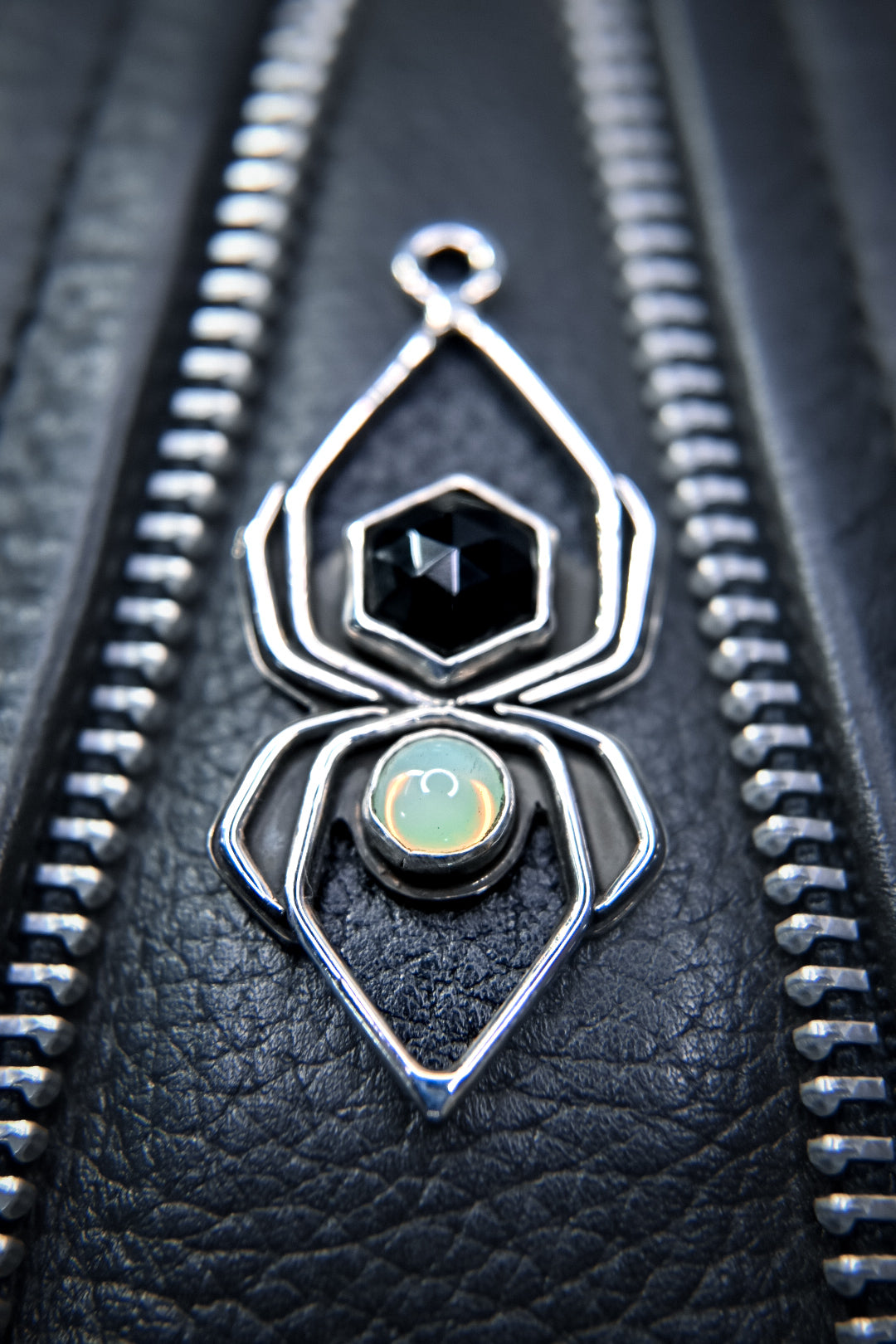A striking pendant featuring a faceted black spinel paired with glowing uranium glass, hand-set in sterling silver. The geometric frame echoes the shape of a spider, giving this piece an edgy, gothic feel while still being refined enough for everyday wear.